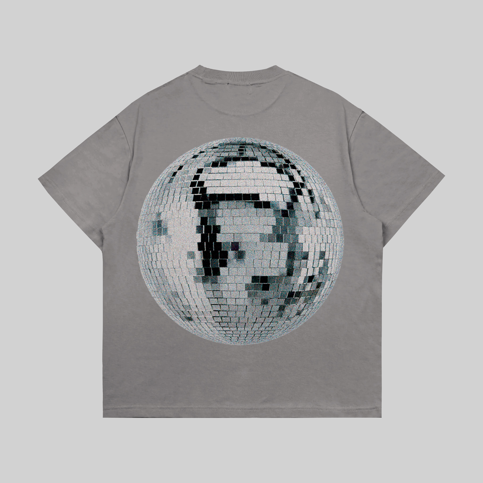 Playera Gris Oscuro con diseño de bola disco en tonos grises con efecto granulado retro. Transmite una vibra nostálgica y fiestera, ideal para un estilo vintage y urbano.